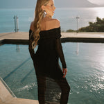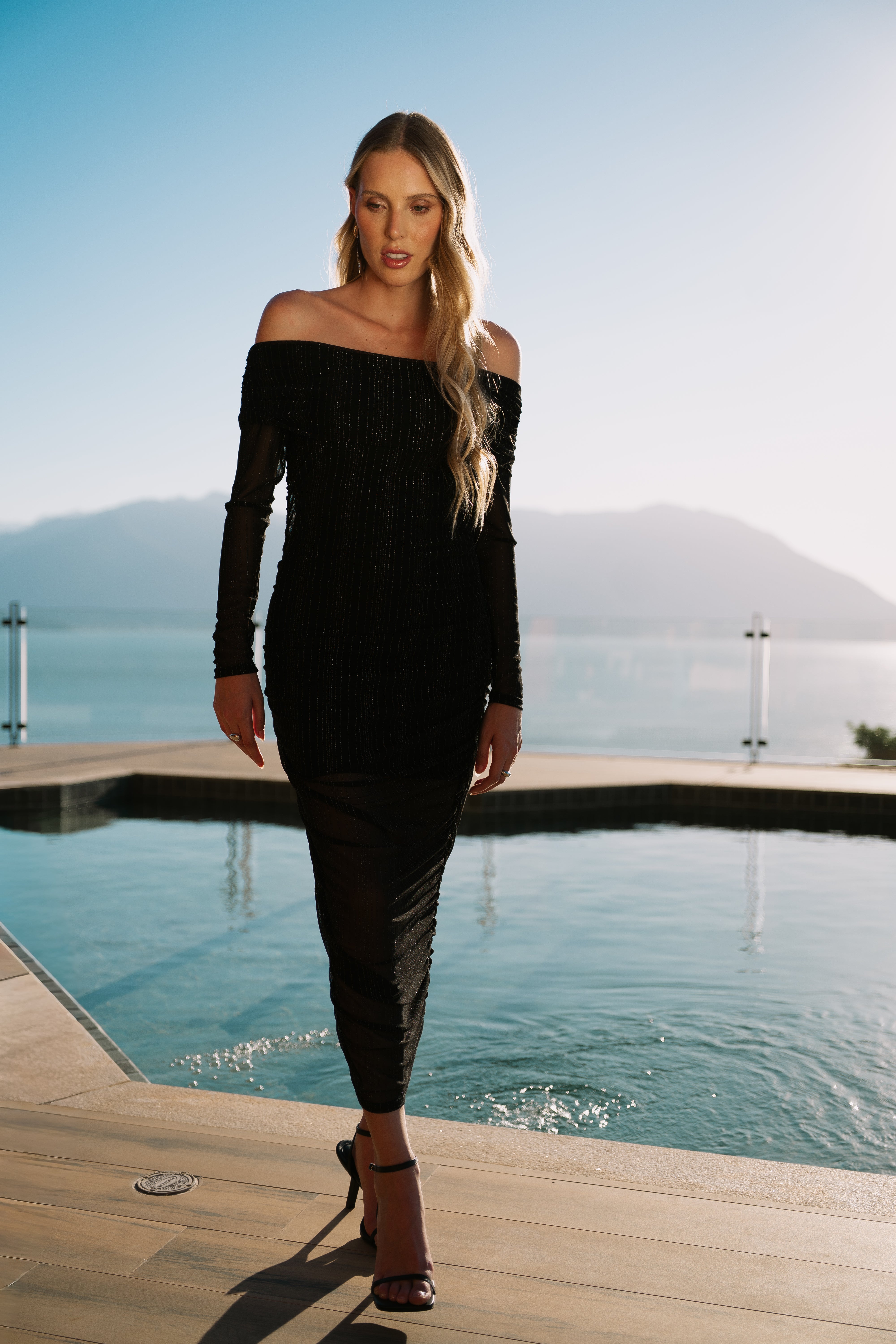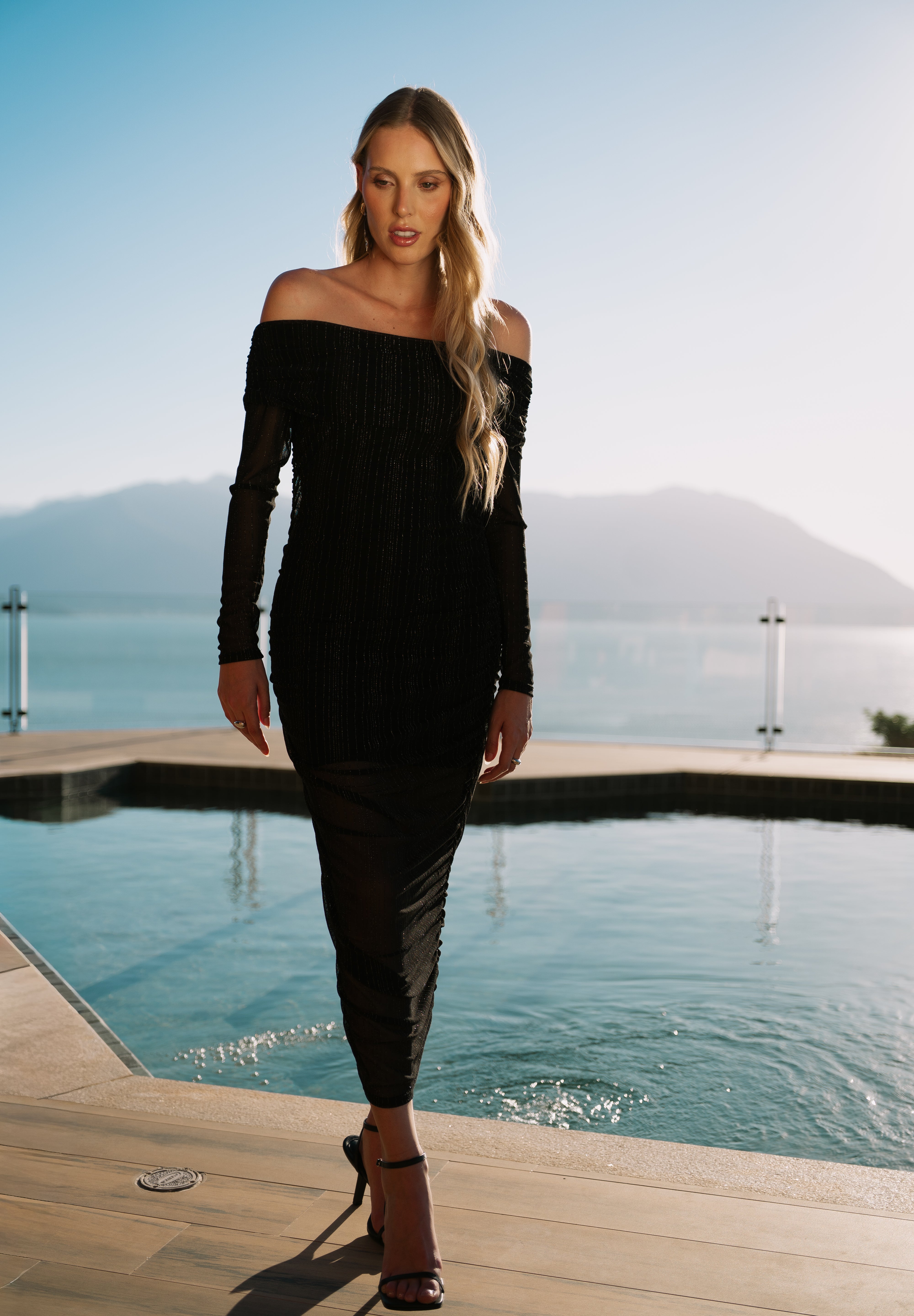 Vestido feminino Anna em tule lurex prata, com drapeado nas laterais e decote reto ombro à ombro. O tule em lurex abraça o corpo e realça as curvas.