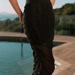 Saia feminina Anna em tule lurex prata, com drapeado nas laterais. A leve transparência realça a sensualidade e valoriza o poder feminino com elegância.