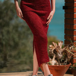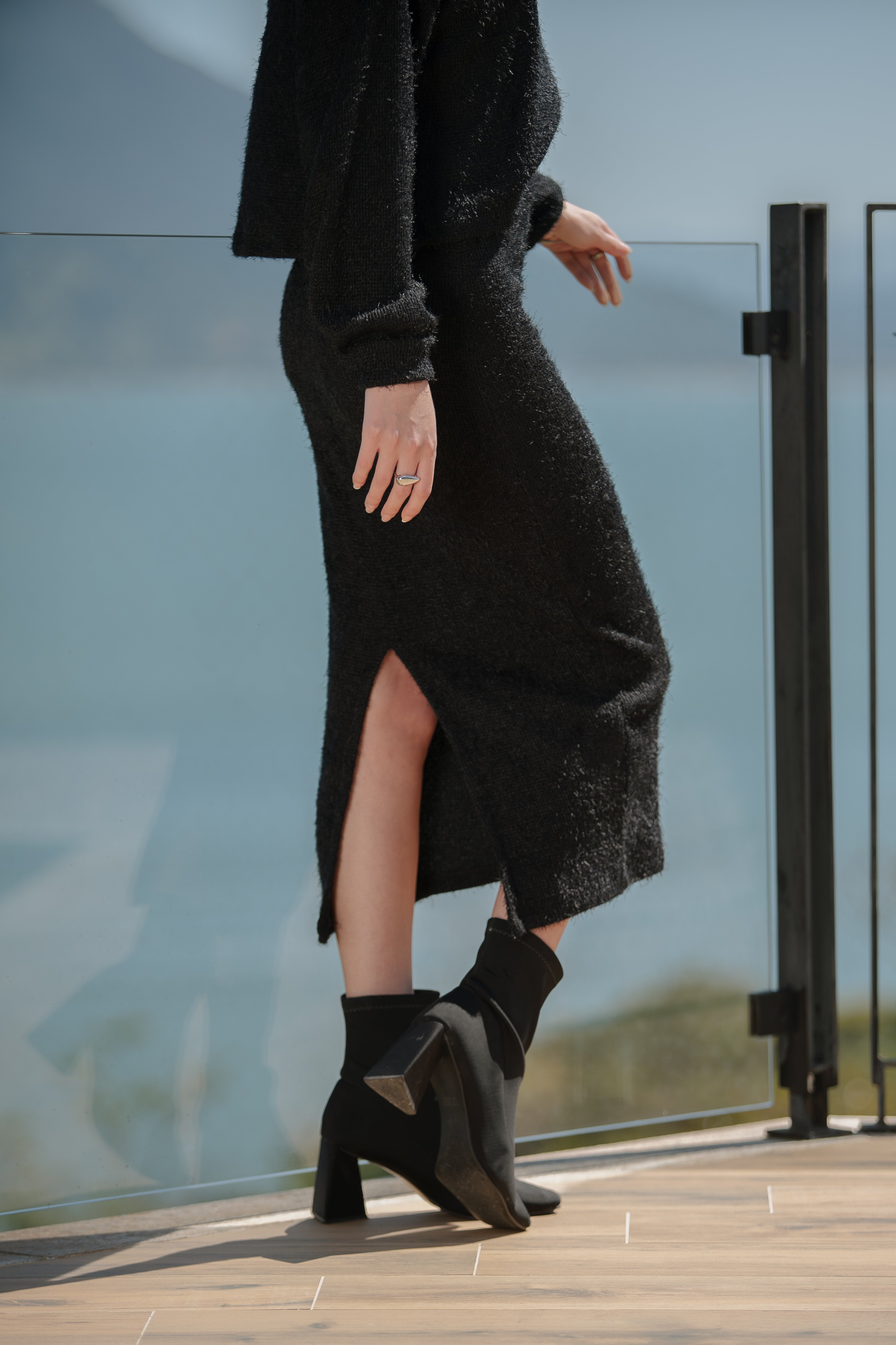 Saia feminina Nina em tricot felpado, com comprimento mídi e fenda costas, que abre somente com o movimento do corpo. O shape ajustado na cintura e quadril valorizam a silhueta.