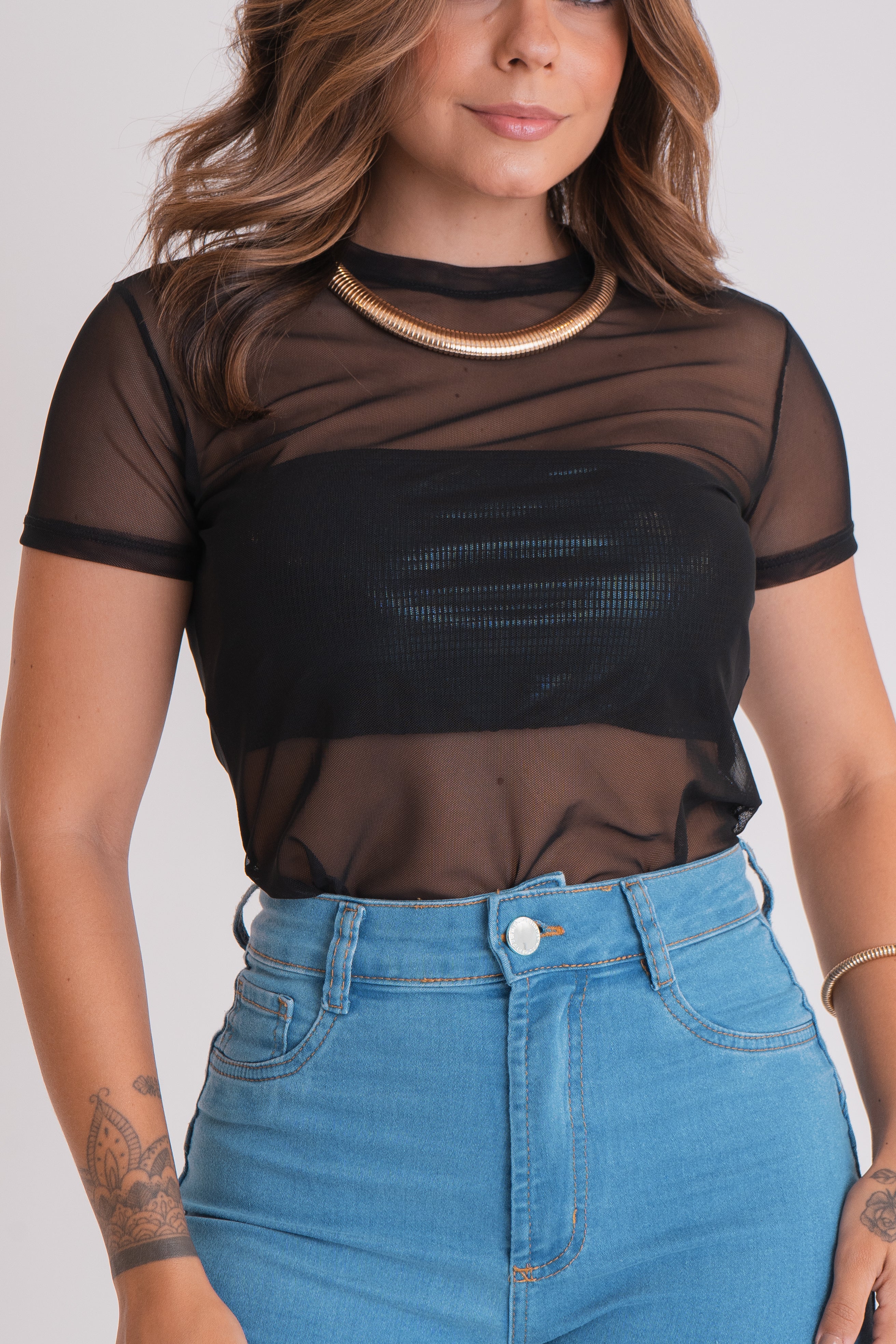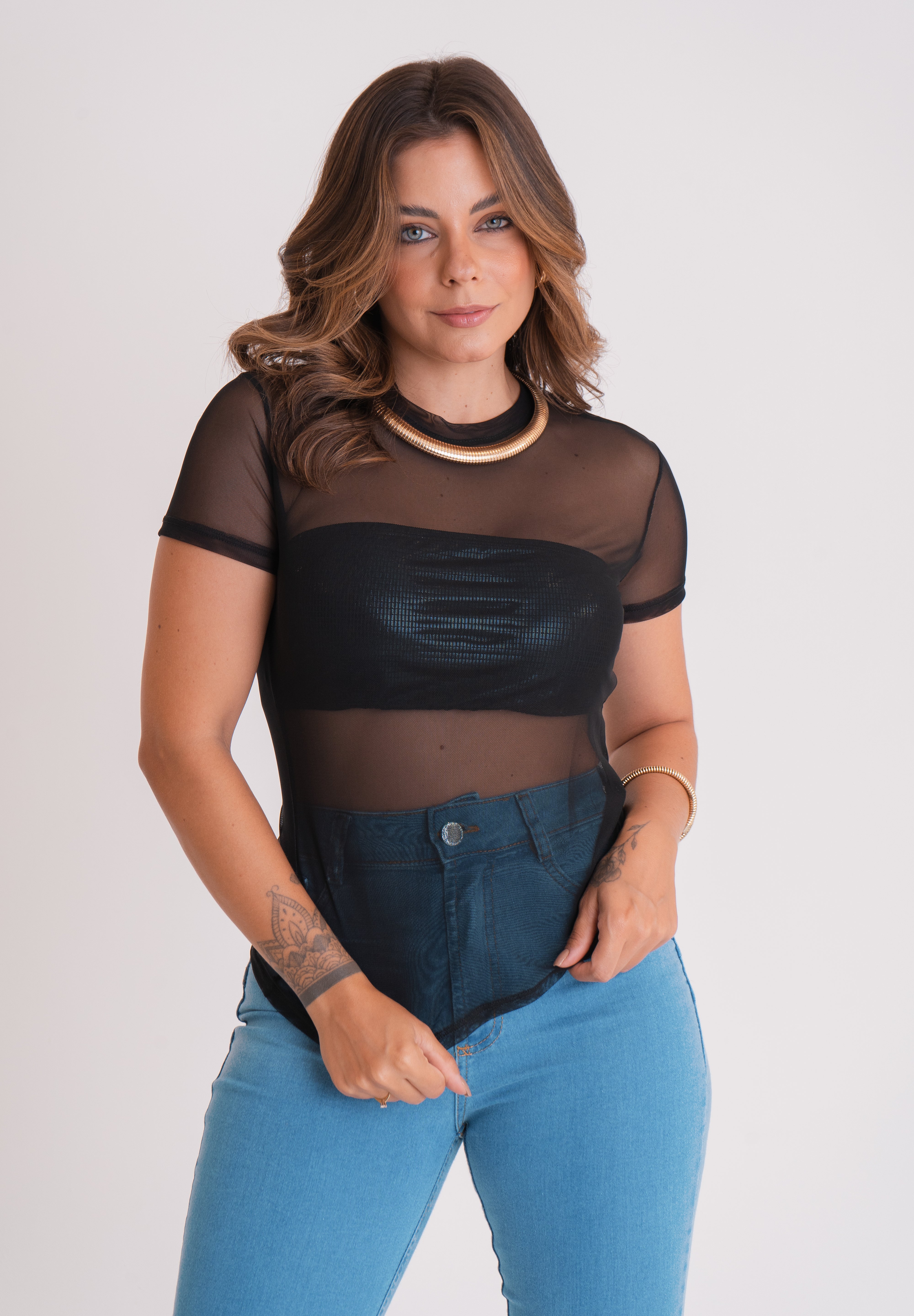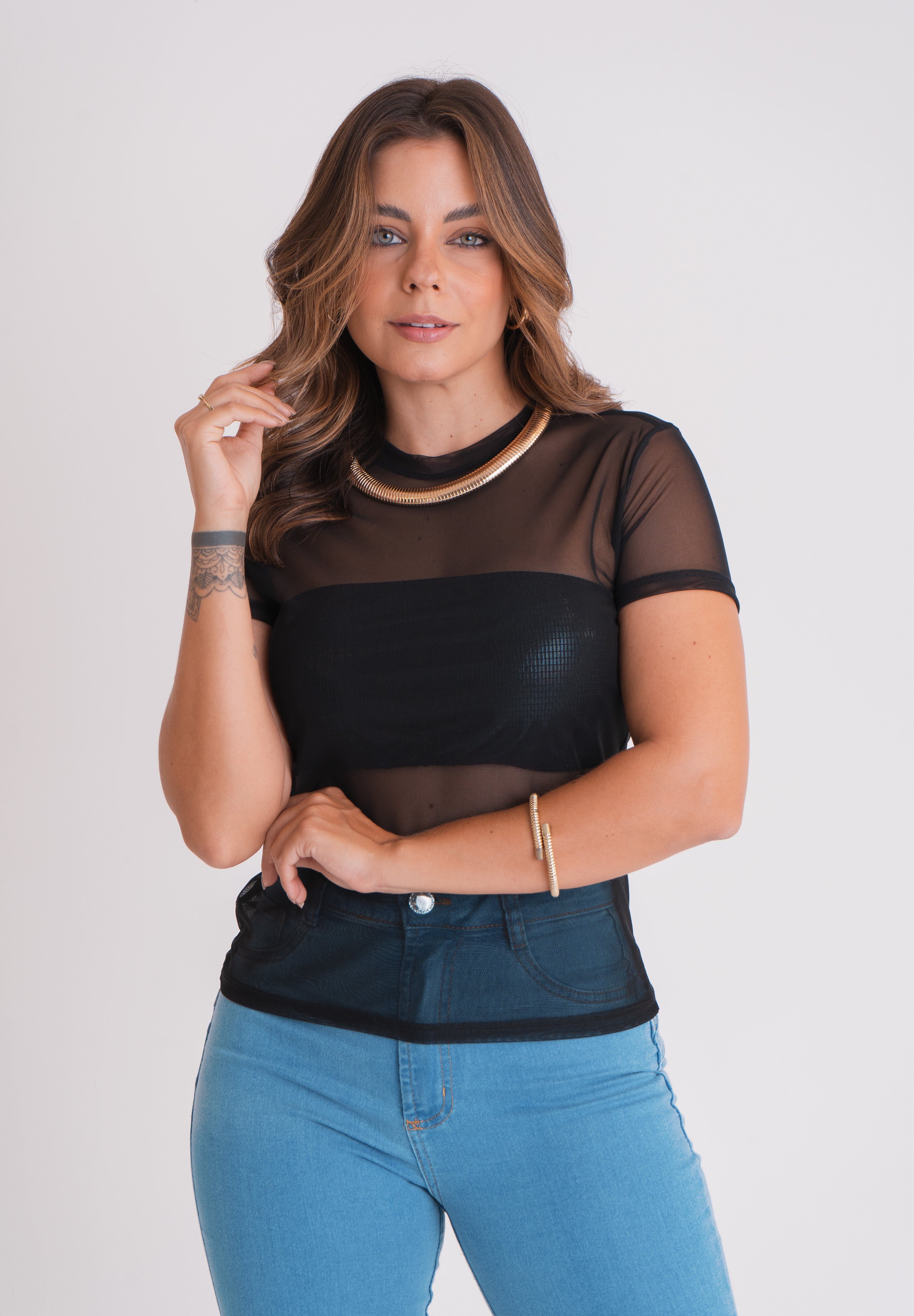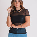 Uma baby look de tule com com bainha estreita nas mangas e barra é uma peça de roupa feminina moderna e delicada, que combina a leveza e a transparência do tule com um toque de acabamento esportivo, dado pela transparência.