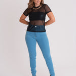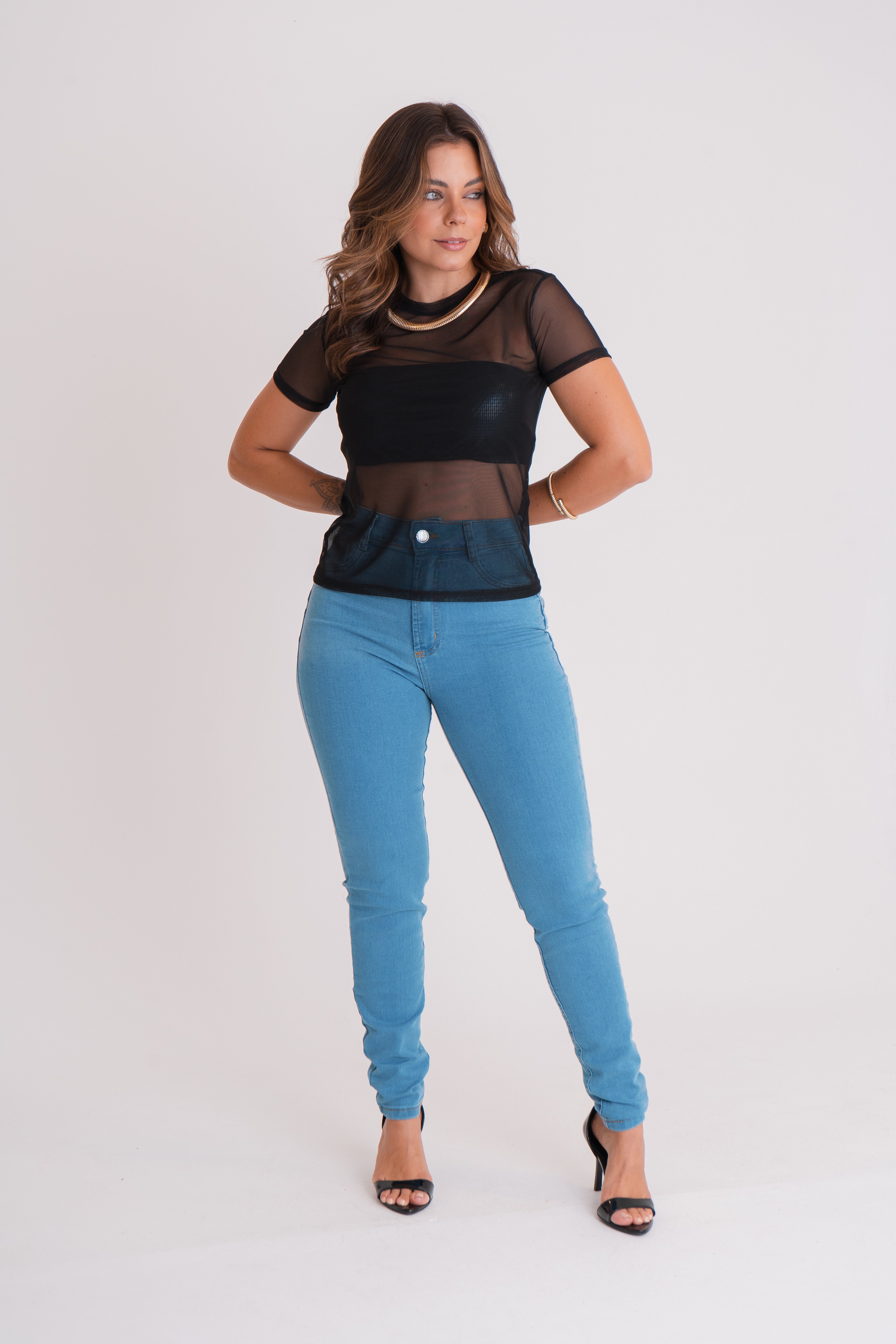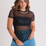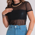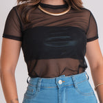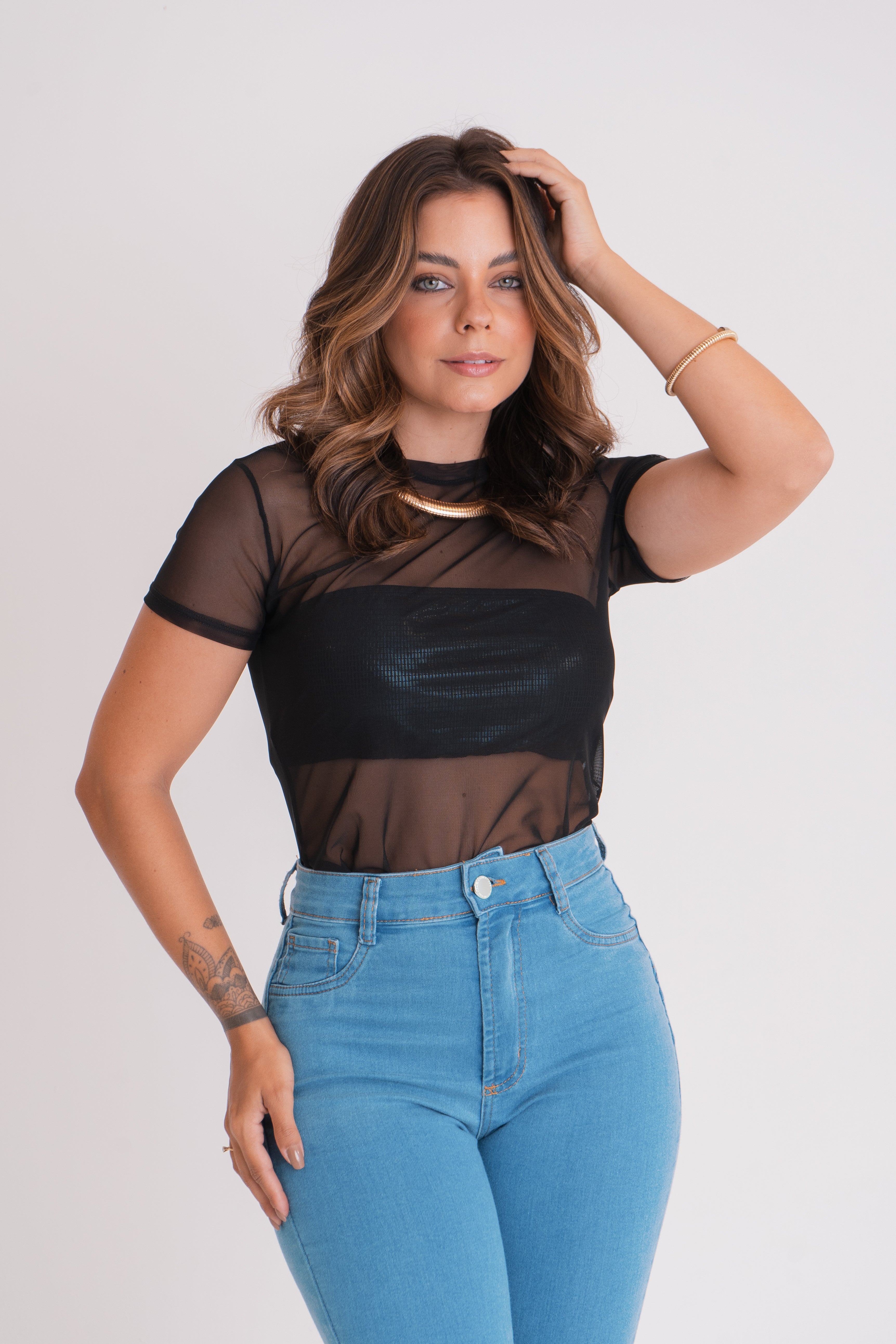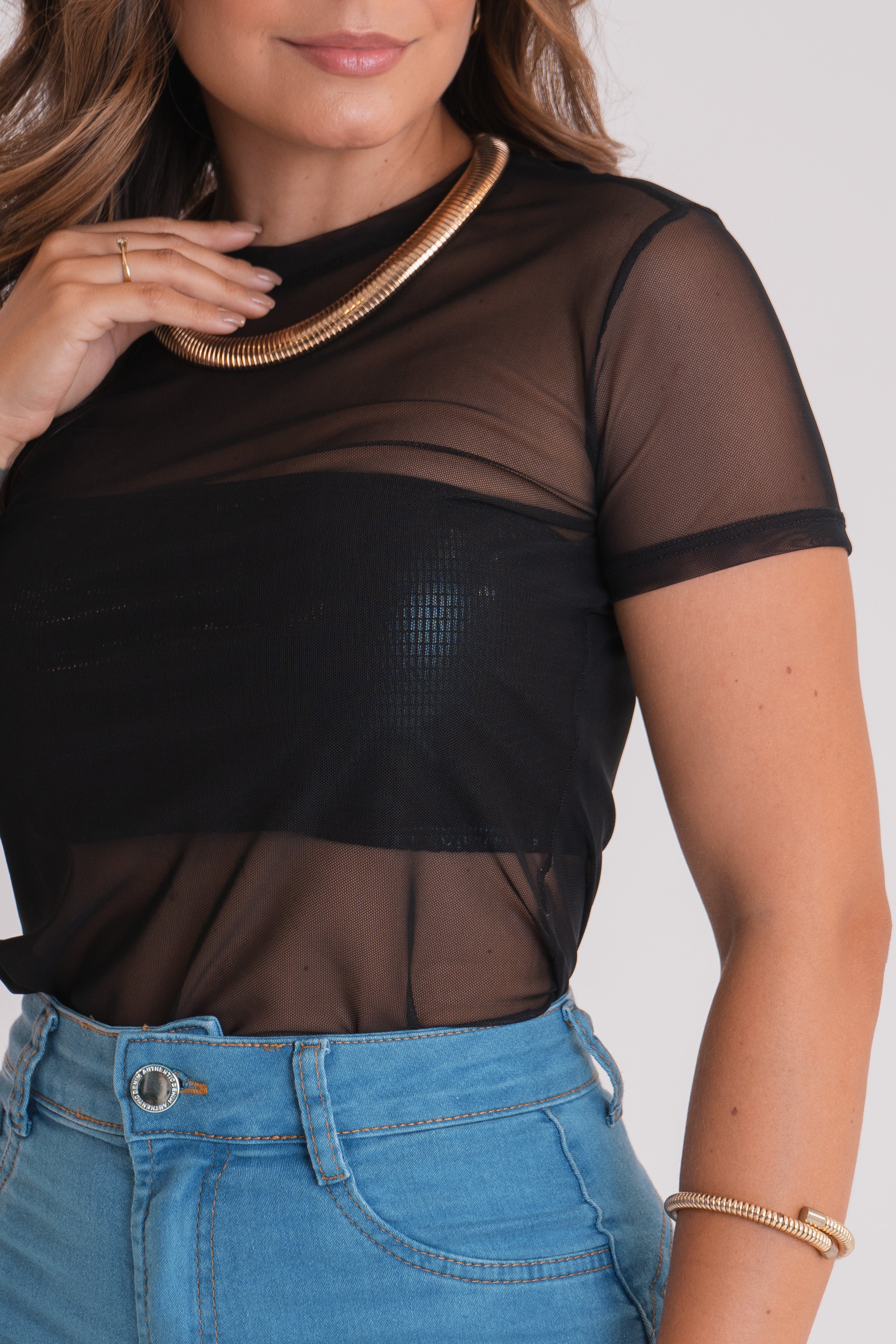 Uma baby look de tule com com bainha estreita nas mangas e barra é uma peça de roupa feminina moderna e delicada, que combina a leveza e a transparência do tule com um toque de acabamento esportivo, dado pela transparência.