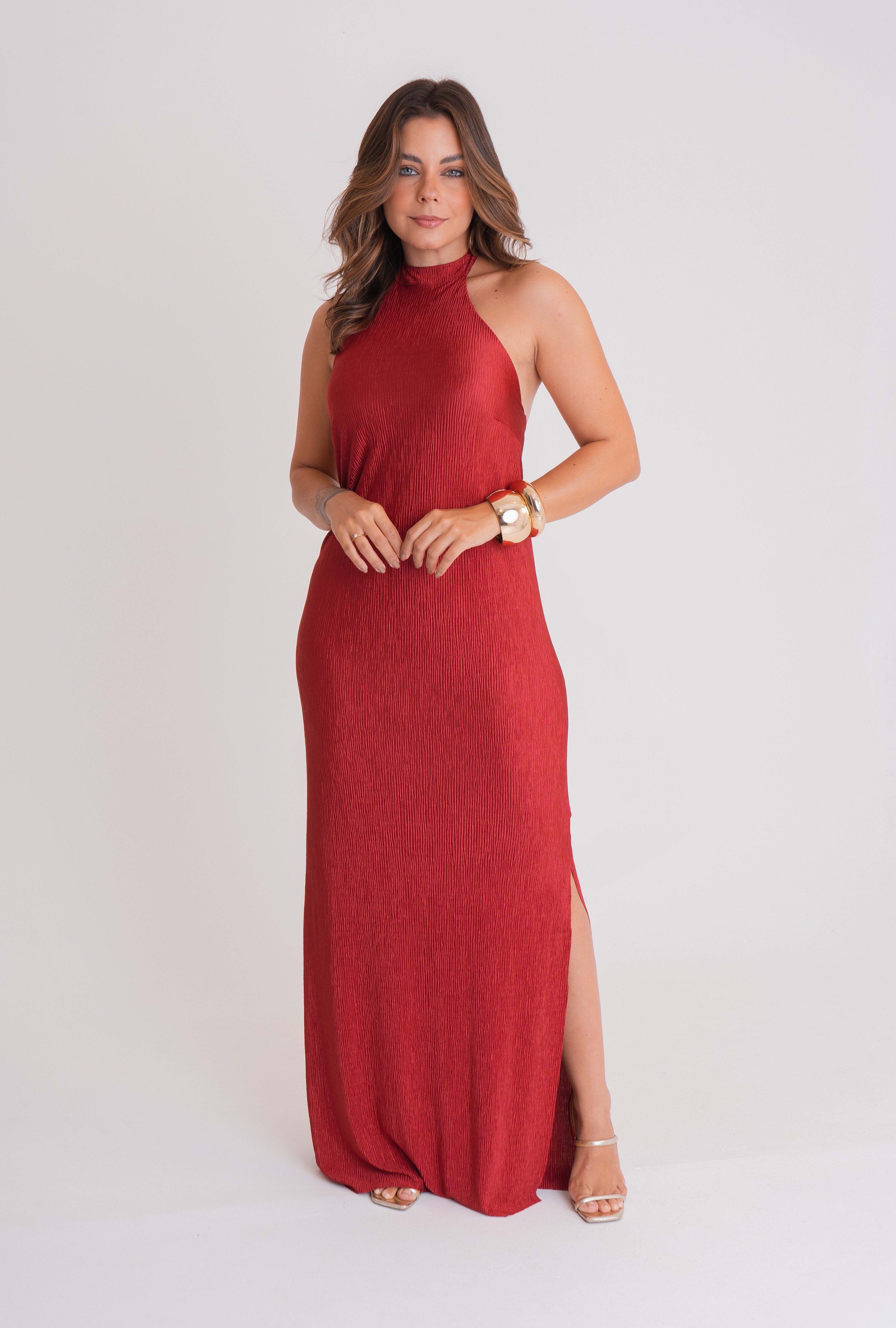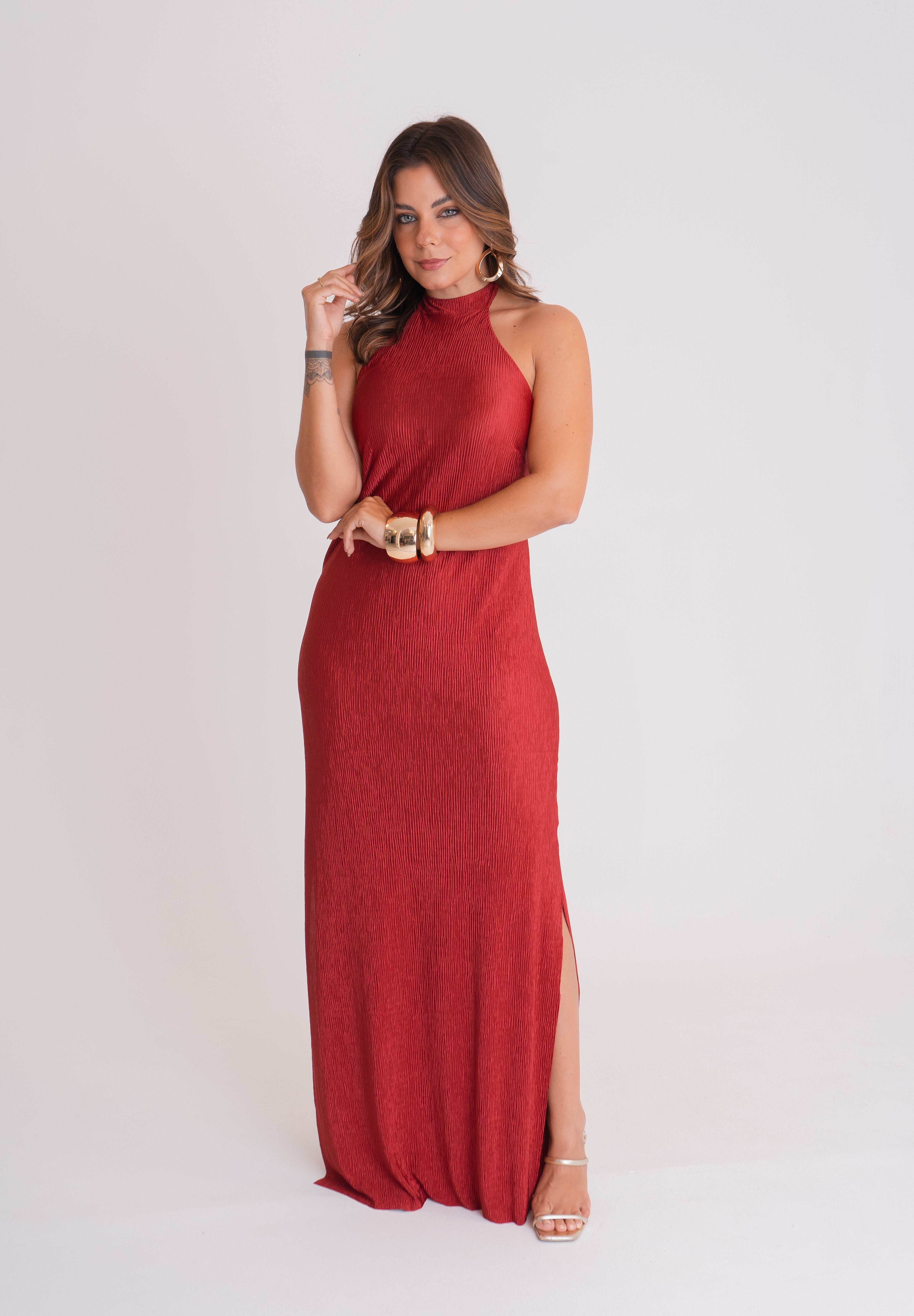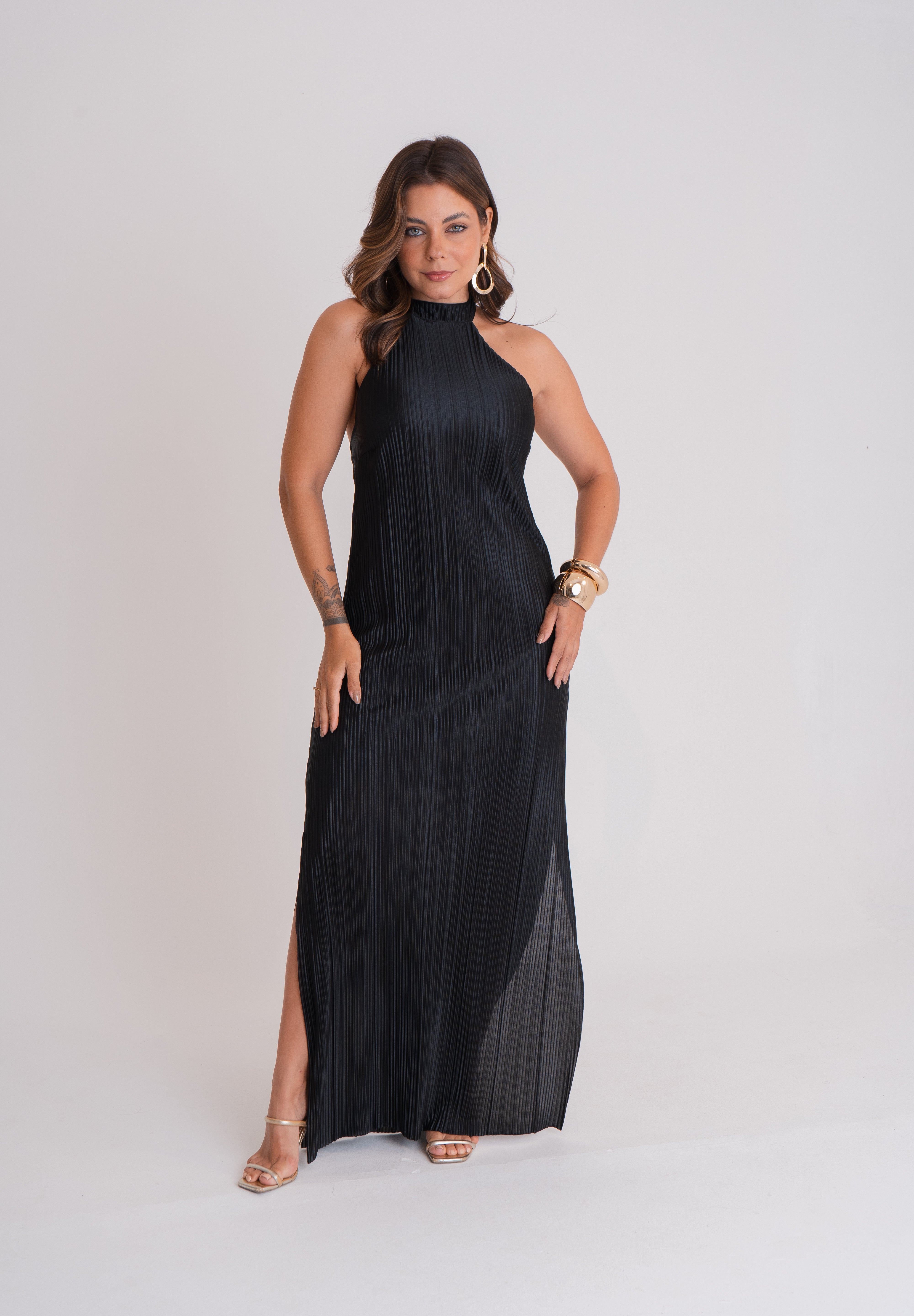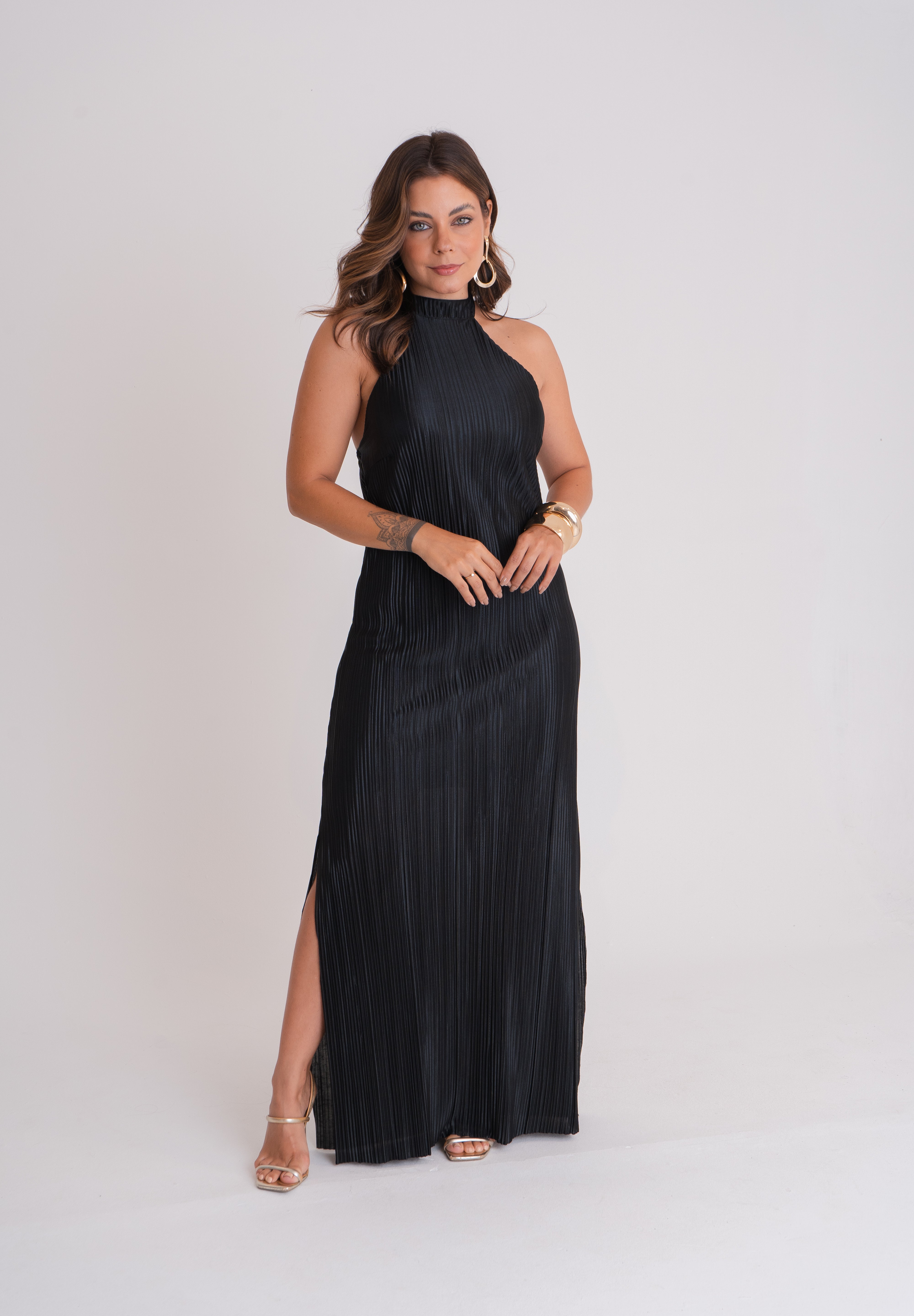 Vestido Longo Cavas Abertas Plissado Poliéster