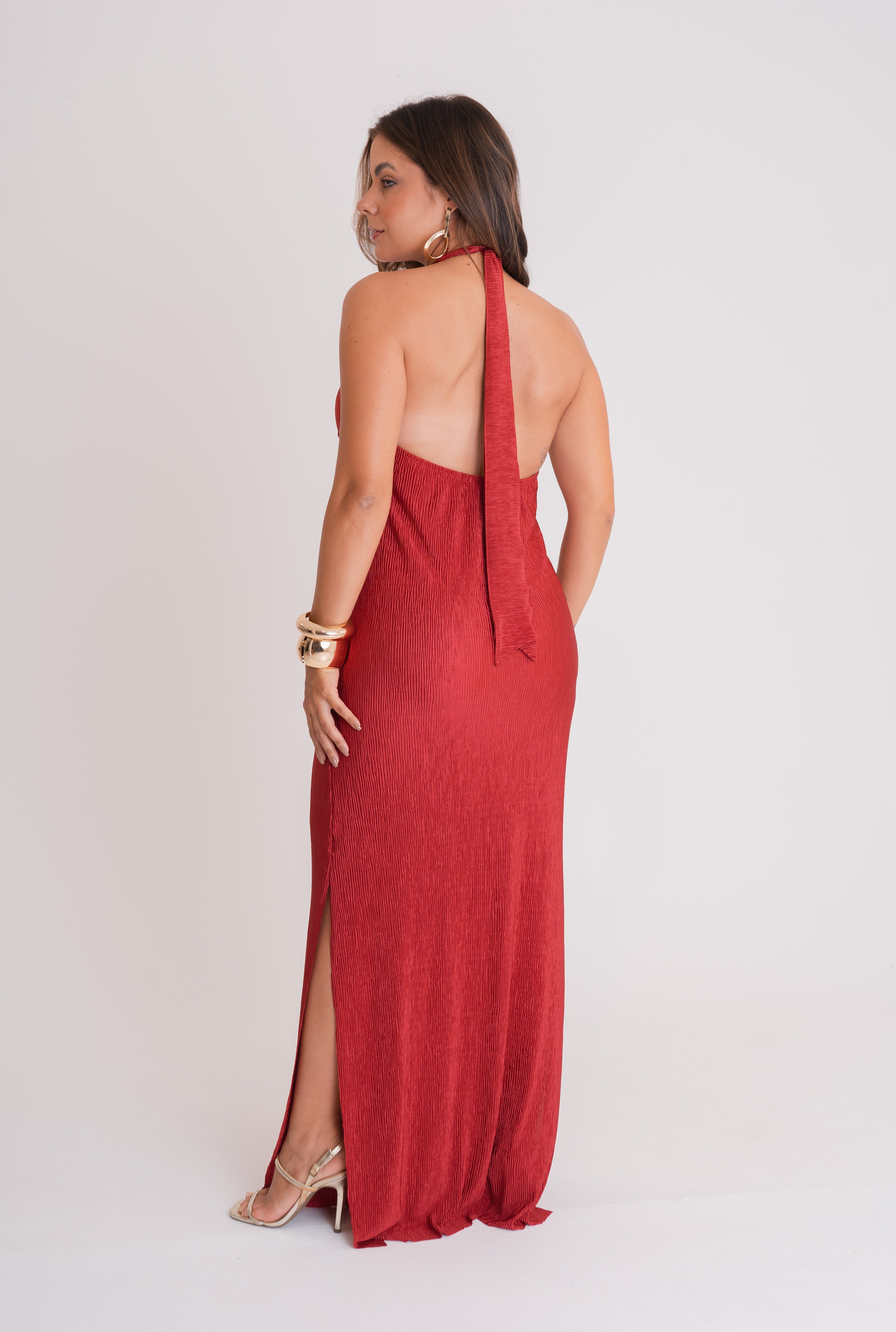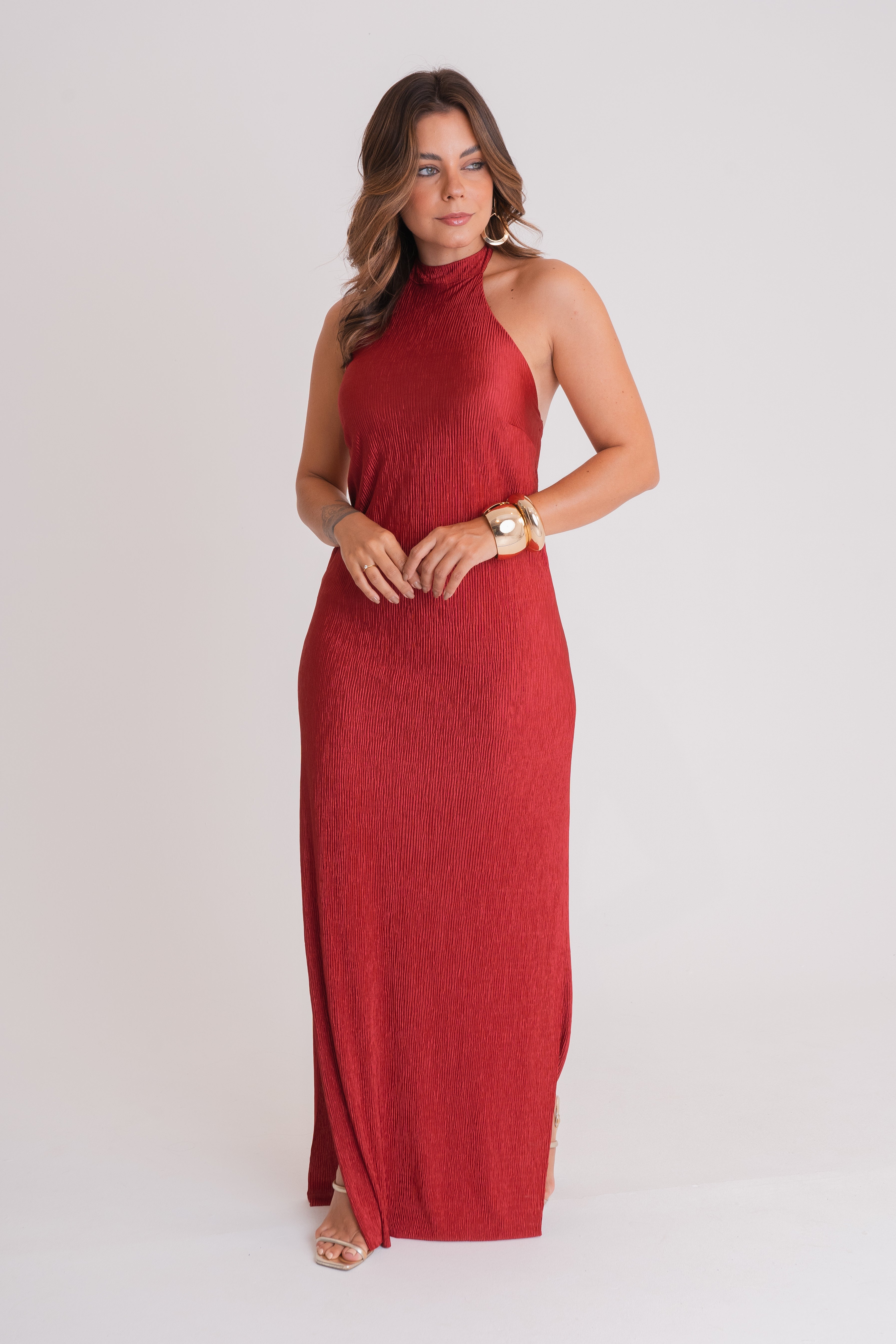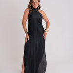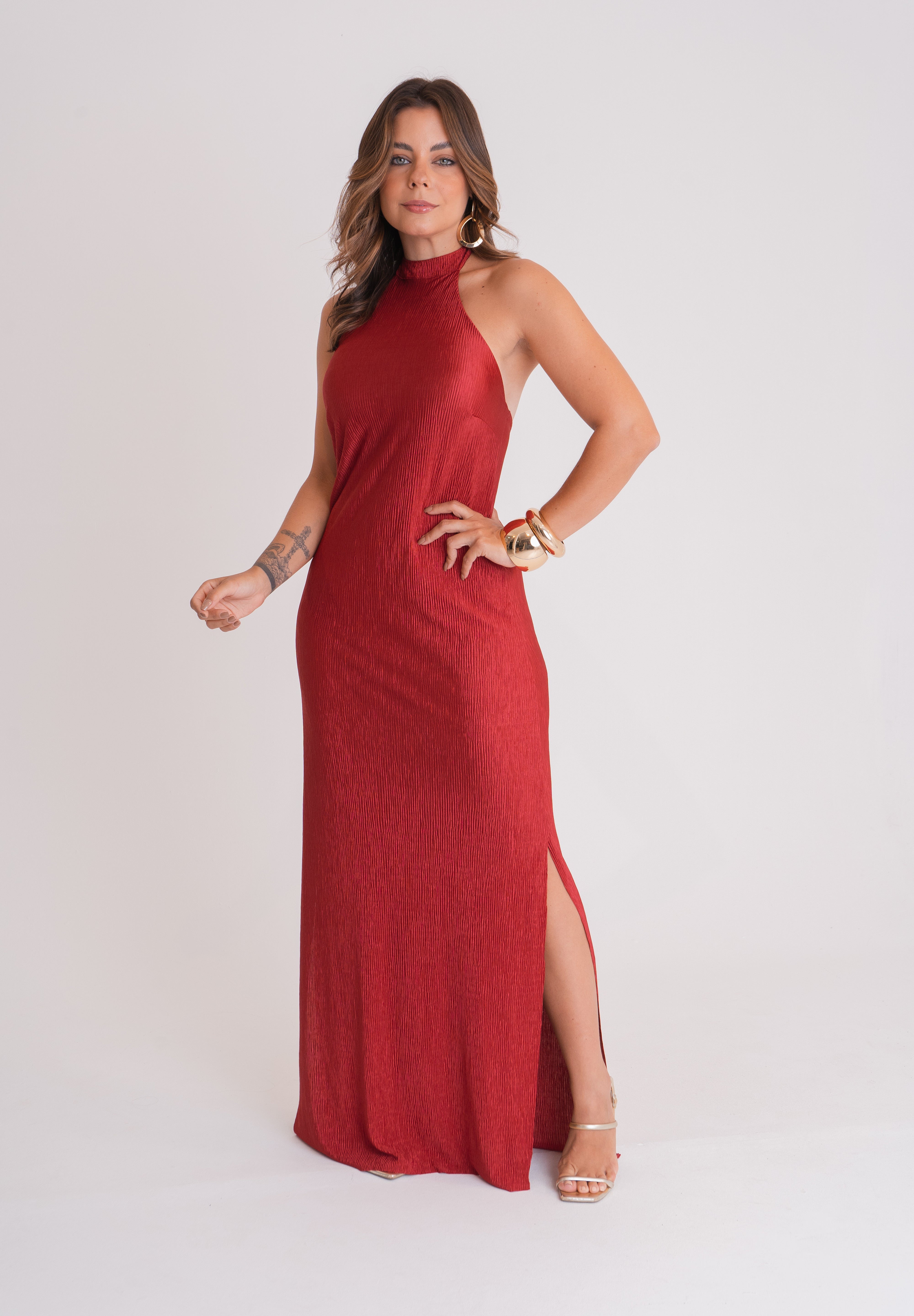 Vestido Longo Cavas Abertas Plissado Poliéster